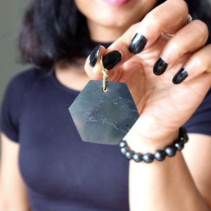Shungite Pendant Stylish Security Stone Hexagon Gold