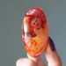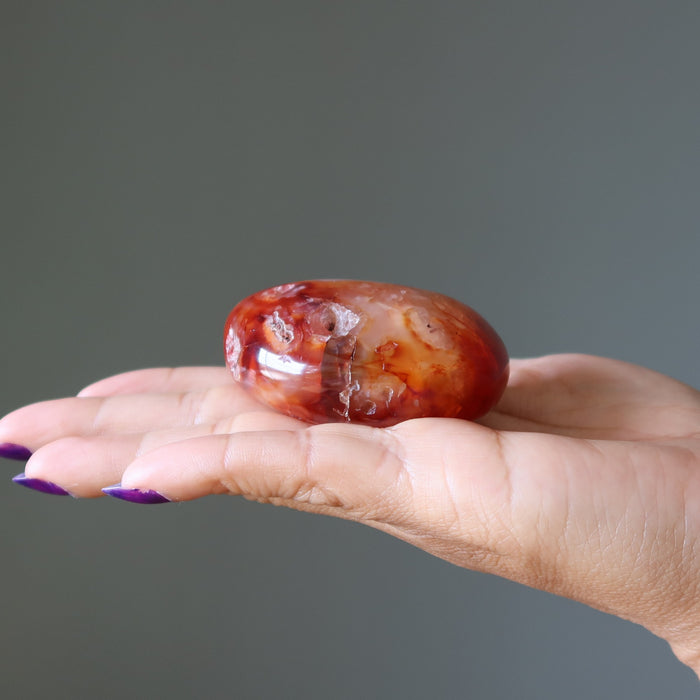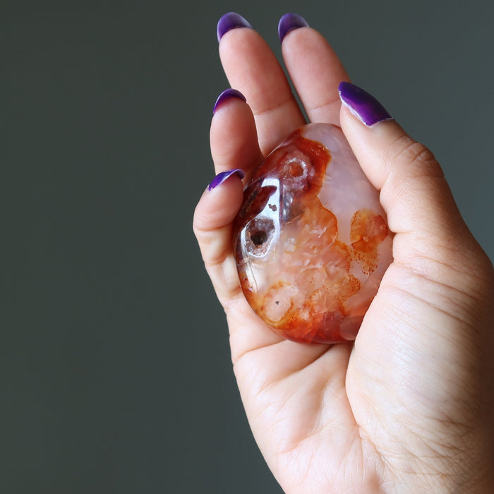 Your Carnelian palm stone is natural and untreated from Madagascar. It shows red, orange, and white tones. May show organic pits, craters, and crevices. Each stone is unique.
