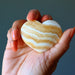 Your new heart features natural and untreated Calcite. This is a golden orange stone with bands of white veins and may show black mineral inclusions. Each is unique. Hearts are measured by width. It is not a replacement for medical treatments.