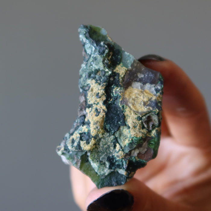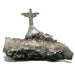 Your new stone is an untreated raw formation of Amethyst from Brazil. This is a matte gray rock showing shiny purple crystals. A silver tone Christ the Redeemer graces the top of the stone.