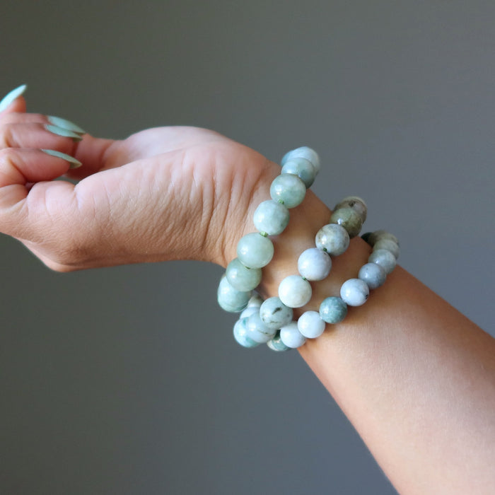 Your new bracelet features authentic Nephrite Jade gemstones with pale to dark green tones. They may also show white and yellow patches and dark veins. The stones are polished into roundish beads and are beaded on a sturdy stretch cord. Each stone differs. Beaded in the Satin Crystals studio in the USA.