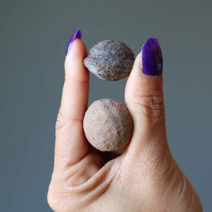 Your stones feature natural and untreated Moqui Marbles from Utah, USA. The rounder one is female. The one with a ridge, protrusion, or flatter disc shape is male. Each stone differs in size, shape, color, and formation.