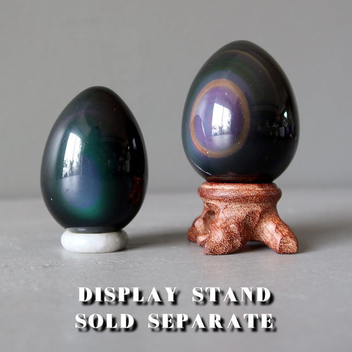 Your new egg is polished from natural and untreated Rainbow Obsidian. This is a black volcanic stone showing mesmerizing rainbow sheen in direct light. Your egg may display purples, greens, yellows, or blues. You may also get the occasional white snowflake occlusion organic to Obsidian. Each stone is unique. Showcase your crystal on a display stand.