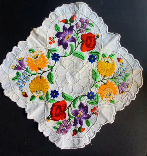 View full detailsThis table centerpiece is a vibrant showcase of authentic Hungarian Kalocsa folk art, featuring a lush garden of hand-stitched wildflowers. The den...