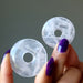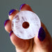 Your new crystal donut is polished from natural Rose Quartz. This is a translucent pink stone.