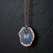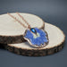 Your new necklace showcases natural Labradorite and a dried blue flower in copper metal. The rose gold-plated brass chain is 18 inches long.