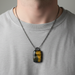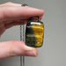 Your new necklace showcases a rectangular bluish-black Hawks Eye and Golden Tigers Eye stone. The gunmetal chain is 18 inches long.