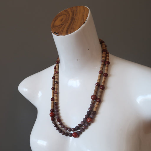 View full detailsTake a ride on the wild side with this double strand gemstone necklace beaded with squiggly patterned bamboo beads. The brown wood tubes are stru...