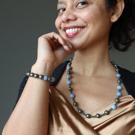 • Angelite Bracelet Gold Pyrite Blue Angel Abundance