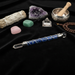 Your new wand features natural and untreated Lapis Lazuli. These are dark blue gemstones with white Calcite and gold Pyrite inclusions. The tumbled stones are encased in a glass wand, wrapped in silver wire, topped with a clear Quartz point, and finished with a Clear Quartz sphere. Each stone is unique.