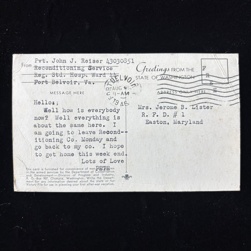 View full detailsSocial History: Typed by Pvt. John J. Reiser (Serial No. 43030851) to Mrs. Jerome B. Lister in Easton, Maryland while he was stationed at Fort Belv...