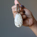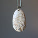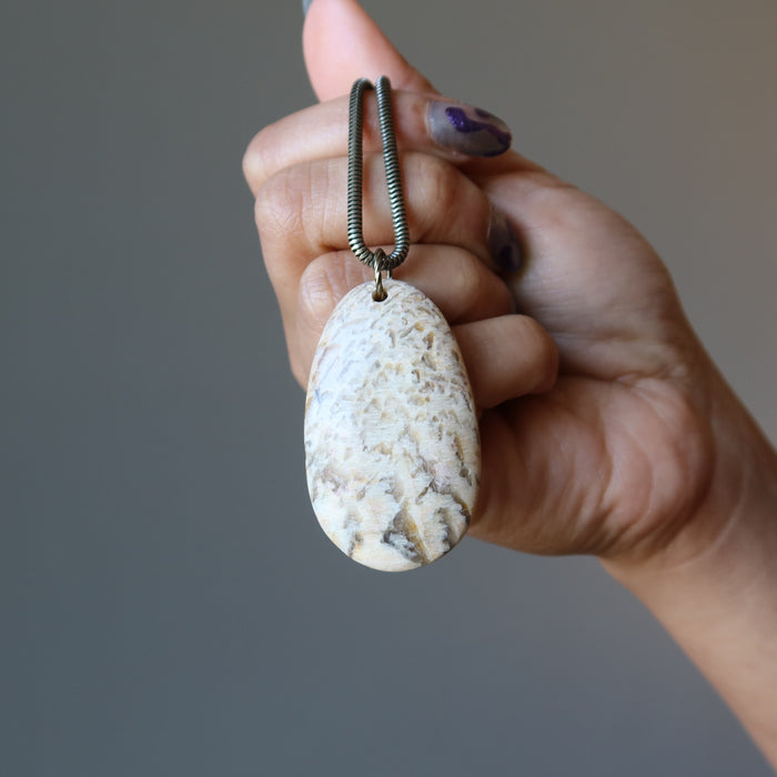 Your new necklace features natural and untreated Zebradorite or Zebra Moonstone, which is a yellowish-brown stone with translucent brown Smoky Quartz stripes. The stone is polished into a pear shape and hangs from an antique gold-plated brass snake chain secured with a lobster claw clasp. There is a removable end if you want to add additional charms to the chain. Assembled in the Satin Crystals studio in the USA. Each stone is unique.