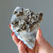 Your one-of-a-kind stone features natural and untreated Chalcopyrite. The metallic, brassy crystals grow on a rocky matrix.