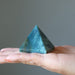 Your new pyramid is polished from natural and untreated Moss Agate from India. The white Agate is full of green inclusions and is floating with some red patches. Each stone is unique, smooth, but retains natural dips, caves, veins, and mineral inclusions. Pyramids are measured by width; height will vary.