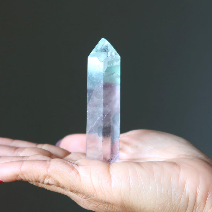 Your tower is polished from natural and untreated Fluorite. This is a translucent stone with green and purple bands. It has 6 facets and can stand on its own. Each is unique.