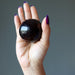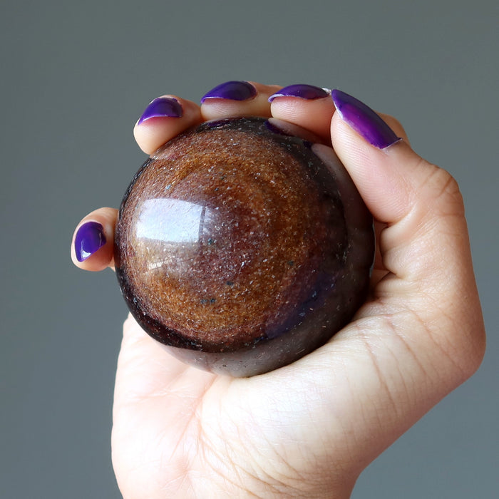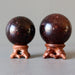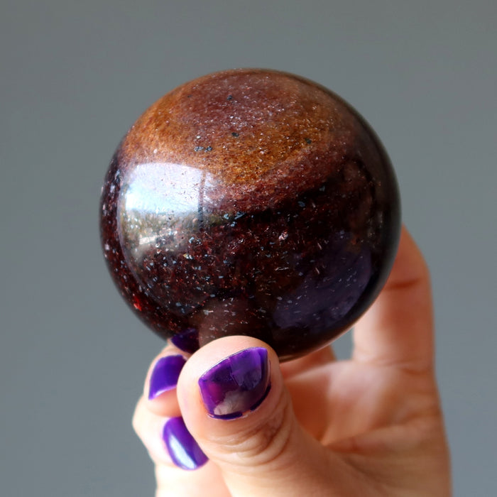 Your crystal ball features natural and untreated deep red to orange Garnet glittering with Mica flakes. It is polished round but retains organic veins, craters, pits, and inclusions. Each stone is unique. Showcase your crystal on a display stand.