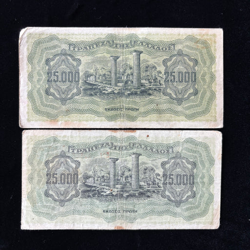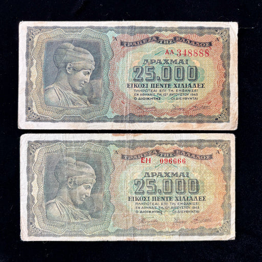 View full detailsThese 25,000 Drachmai notes were issued in Athens on August 12, 1943, during the catastrophic hyperinflationary spiral of the Axis occupation. Own ...