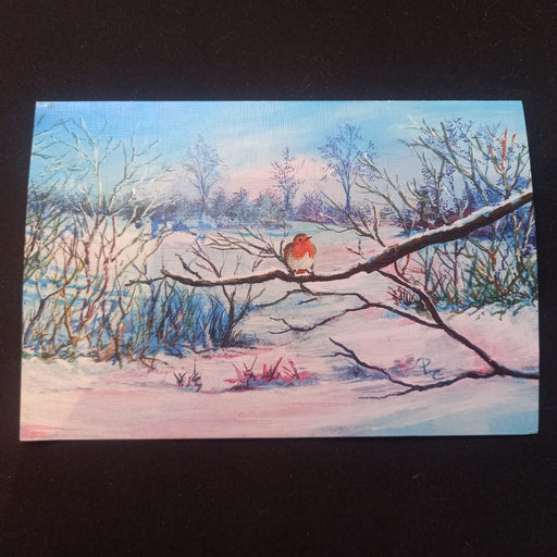 View full detailsThis greeting card transports you to a quiet winter woodland, where the only sound is the soft fluttering of a red-breasted robin. The print is a r...