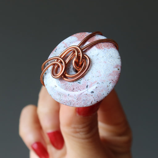 View full detailsDive into earthy love with your new chunky Pink Jasper ring. Measures Ring Size: 5.75Stone Size: 1.1-inch What is my ring size? Visit the Ring Guid...