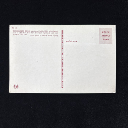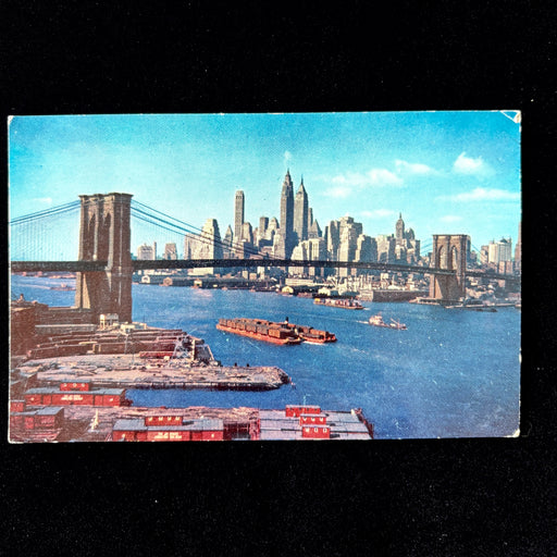 Historical Significance: This postcard features a classic mid-century view of the Brooklyn Bridge with the Lower Manhattan skyline in the backgroun...