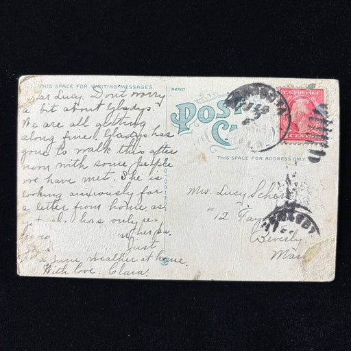 Social History: Features a heartfelt message from "Clara" to a friend in Beverly, Mass., noting that the traveler was enjoying "June weather" duri...