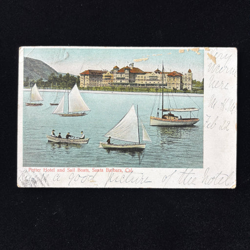 • Antique Postcard 1900s Glitter Art Potter Hotel Santa Barbara Tinsel Sailboats