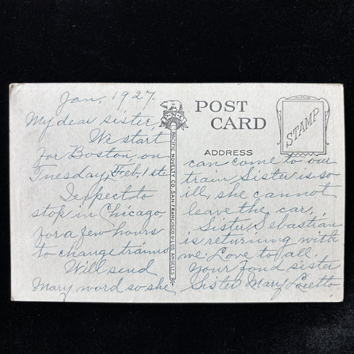 View full detailsSocial History: The handwritten message from January 1927 captures a transcontinental train journey from the West Coast to Boston via Chicago. This...