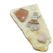 Your new chakra plate features a pale yellow Serpentine slab with a Clear Quartz pyramid, a pink Rose Quartz double-terminated stone, a slice of purple Amethyst geode, and a patterned Red Jasper tumbled stone. Each stone is securely affixed to the slab, creating a ready-to-use tool for chakra layouts.