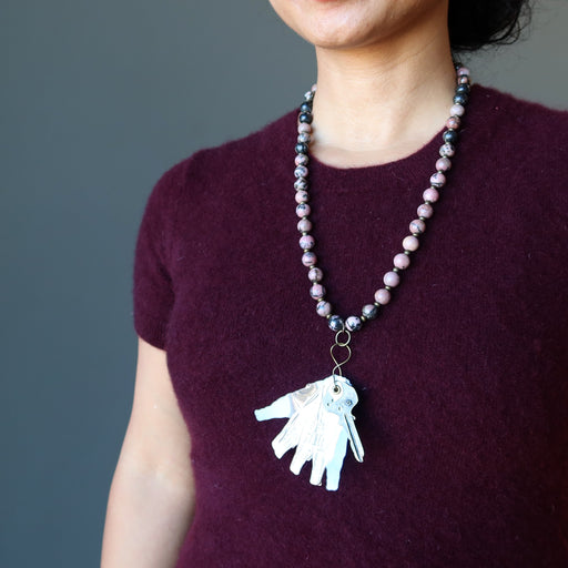 • Rhodonite Necklace Book Lovers Key Antiqued Steel