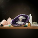 This Amethyst geode cluster is a special spiritual showpiece. Within the attractive purple cove, you find striking Calcite crystals flourishing harmoniously.