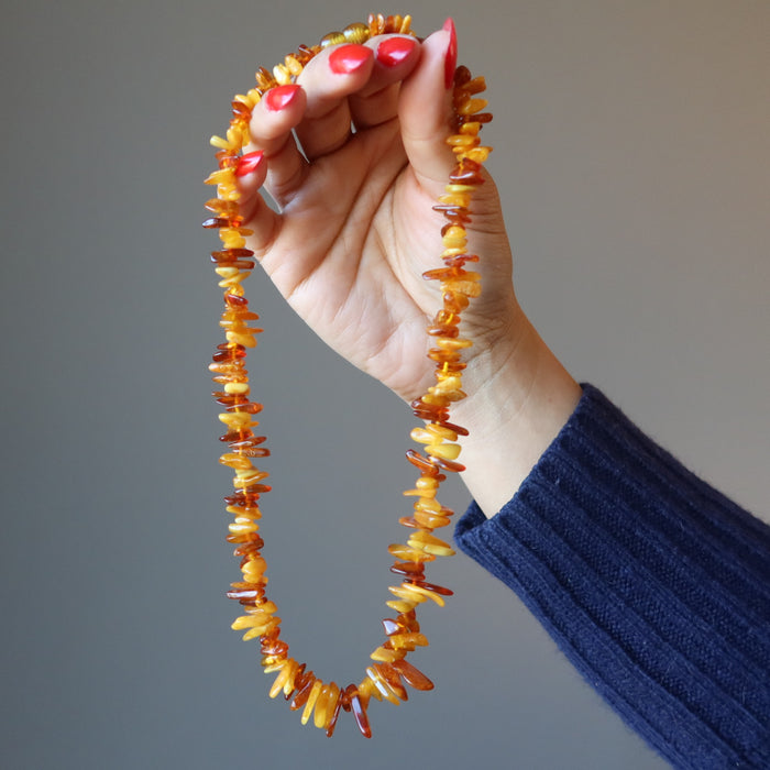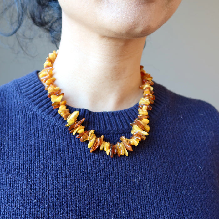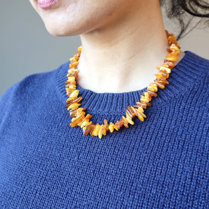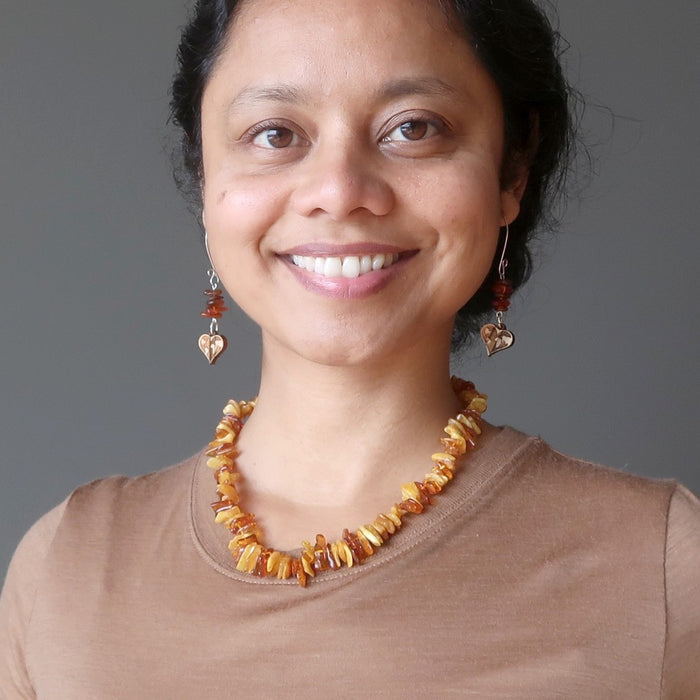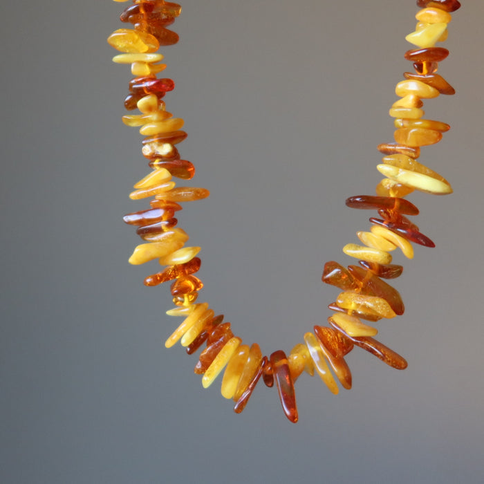 Warm your style and soul with this Amber necklace's autumn colors. Don't limit that joyous and toasty spirit to just one season when you can enjoy it all year through your natural healing Amber necklace.