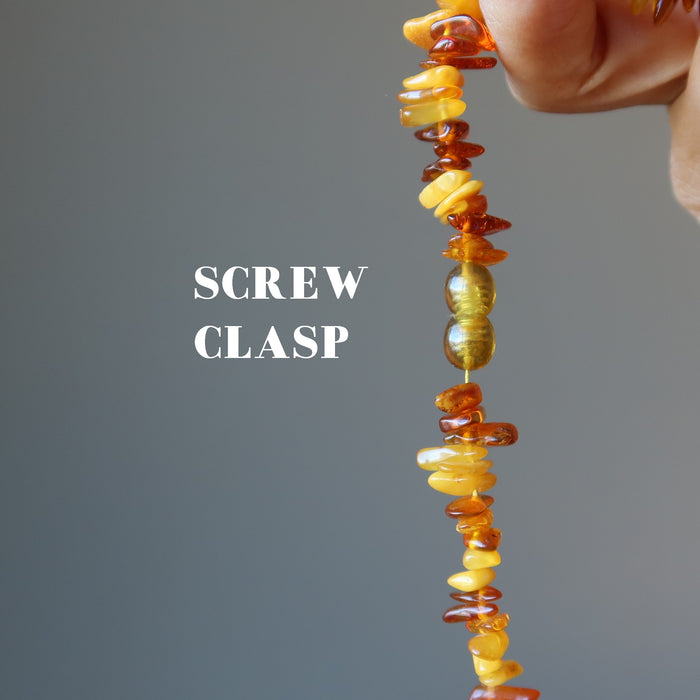 Your new necklace features natural, untreated Baltic Amber from Lithuania. These are yellow and orange Amber gemstones with hints of a darker red individually knotted with a yellow necklace cord. The multi-colored Amber necklace is secured with a screw clasp cleverly disguised in a honey bead. Each gem is unique.