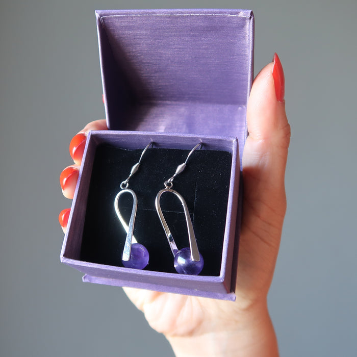 Your new earrings feature genuine Amethyst gemstones. These are dark purple stones with natural inclusions. The Amethyst has been polished into smooth round beads and set in silver-tone dangle earrings.