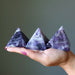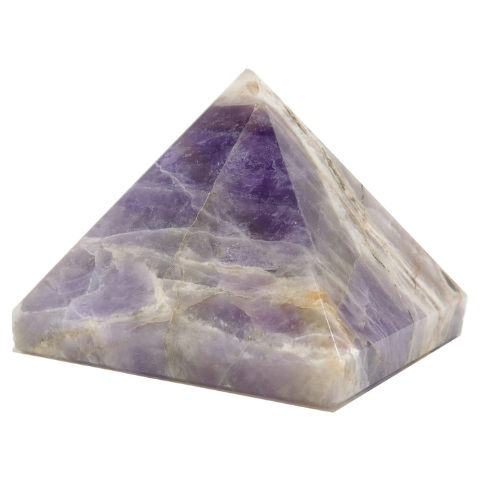 Your new pyramid is polished from natural and untreated Chevron Amethyst. This is a purple stone mottled with white veins and natural inclusions. Each stone differs; retaining natural pits, grooves, veins, and inclusions. Handpolished piece = edges will not be machine-perfect. Pyramids are measured by width; height will vary.