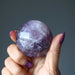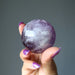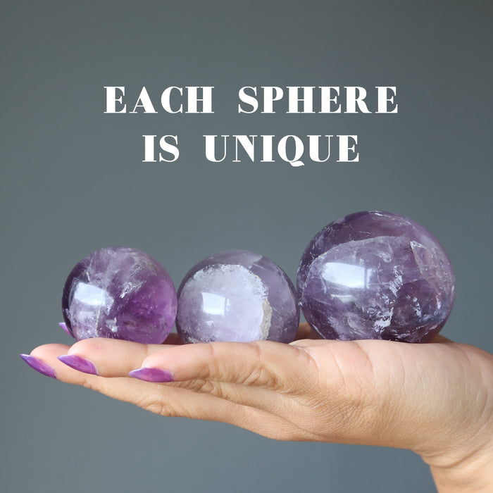 Your new sphere is polished from natural and untreated purple Amethyst from Brazil. It is part-clear and part-cloudy. Each sphere differs; retaining natural pits, grooves, and inclusions. Showcase your crystal on a display stand.