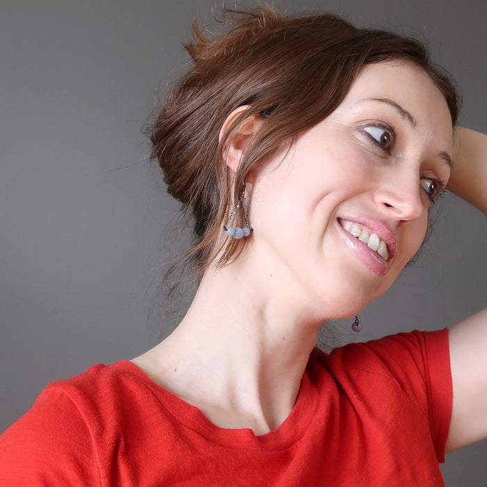 Your new earrings feature natural and untreated glacier blue Angelite gemstones, which may show iron inclusions veins, and white matrix spots. The stones are polished into smooth round beads and hang from metallic black gunmetal chains on gunmetal ear wires. Each stone is unique. Beaded in the Satin Crystals studio in the USA.