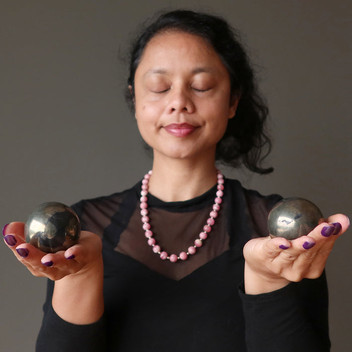 Your crystal ball features natural and untreated Apache Gold from Peru. This is a golden Chalcopyrite stone with Black Schist veins. Each sphere differs in patterns, colors, divots, veins, and inclusions. Showcase your crystal ball by adding a display stand.