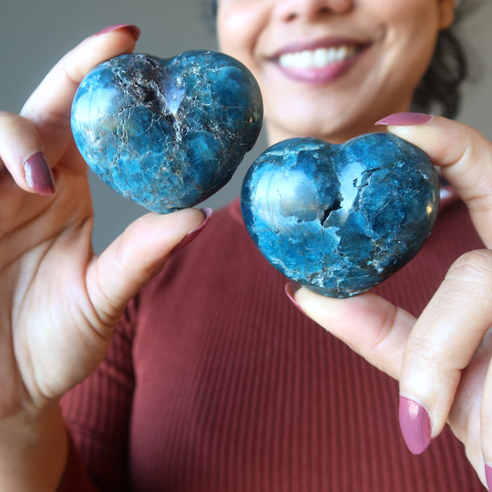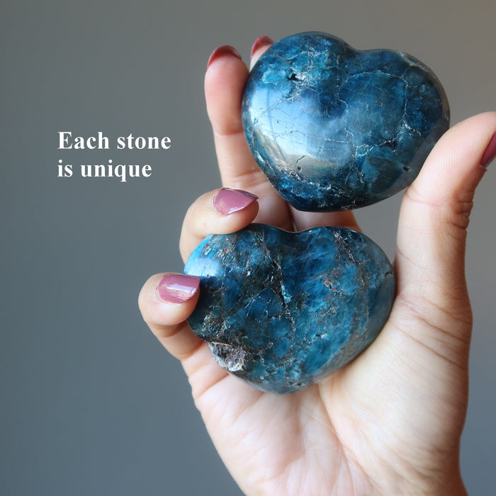 Your new heart features natural and untreated Apatite from Madagascar. This deep, vivid blue stone has been polished into a heart but retains its natural pits, grooves, cracks, and inclusions. Each is unique. Hearts are measured by width.