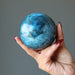Your new sphere is polished from natural and untreated Apatite from Madagascar. This deep, vivid blue stone is polished round. Each sphere differs; retaining natural pits, grooves, and inclusions. Showcase your crystal on a display stand.