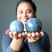 Your new sphere is polished from natural and untreated Apatite in Cleavelandite from Madagascar. This is a blue Apatite stone growing in pale Cleavelandite. Each sphere differs; retaining natural pits, grooves, and inclusions. Showcase your crystal on a display stand.