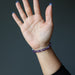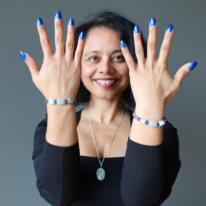 Your bracelet showcases natural and heated Aquamarine with natural and untreated Amethyst gemstones. The Aquamarine is a blue-green stone and the Amethyst varies in purple shades. The rectangle and round stones are strung on sturdy stretch cords. Each stone differs. Beaded in the Satin Crystals studio in the USA.