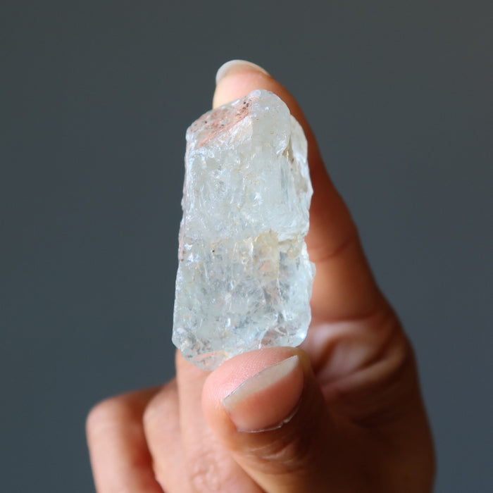 Your 9 new stones are an untreated raw formation of Aquamarine from Brazil. This is a translucent blue-green gem that may show red Iron inclusions. Some pieces are darker, and some are lighter, and they are all real! Each is unique.