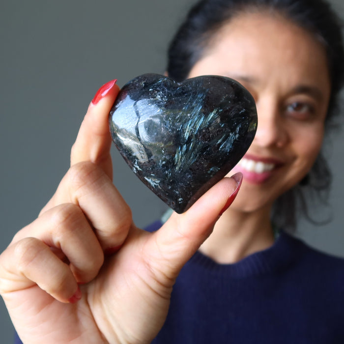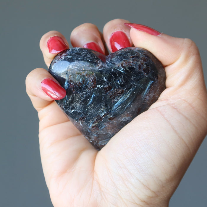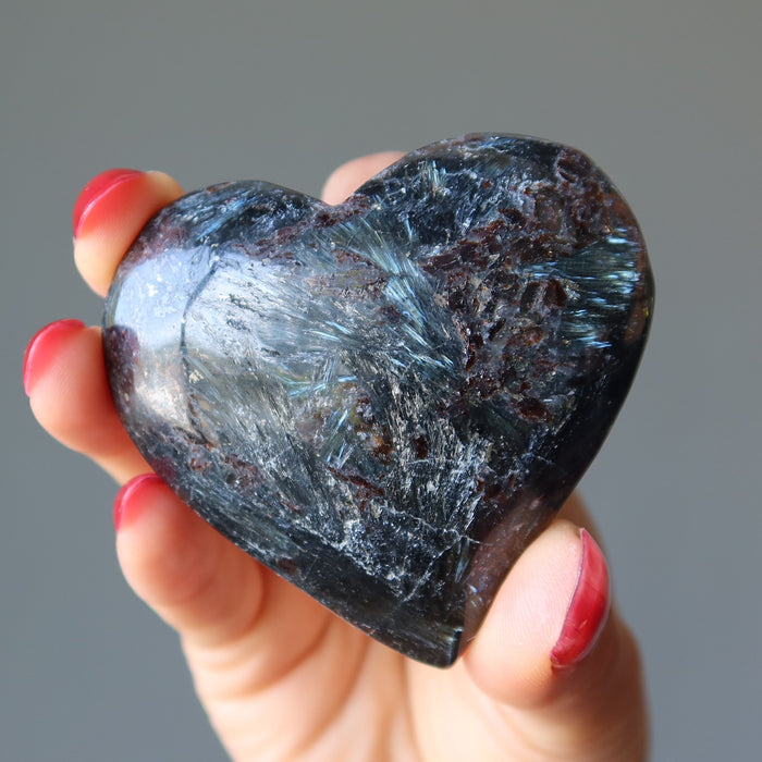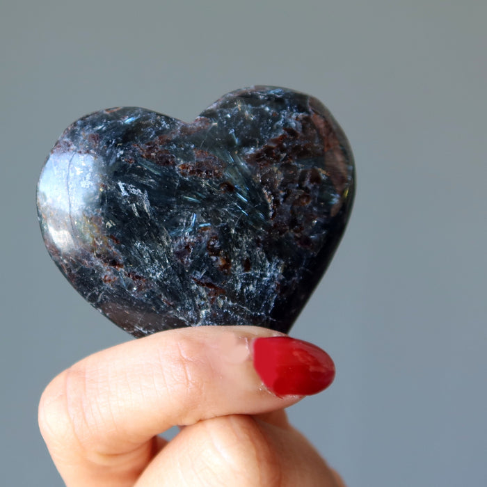 Your new heart features natural and untreated Arfvedsonite. Arfvedsonite is a little-known black stone with long needles that show brilliant blue or silver flashes. It is often mislabeled as blue Astrophyllite. Each heart may show Red Garnet and is guaranteed to have some blue fireworks! Each is unique. Hearts are measured by width.