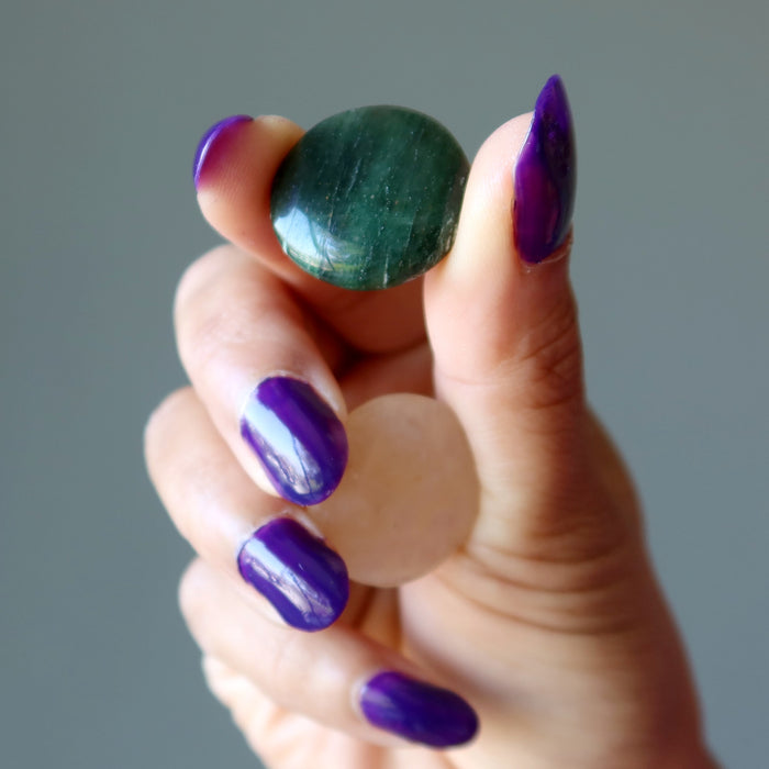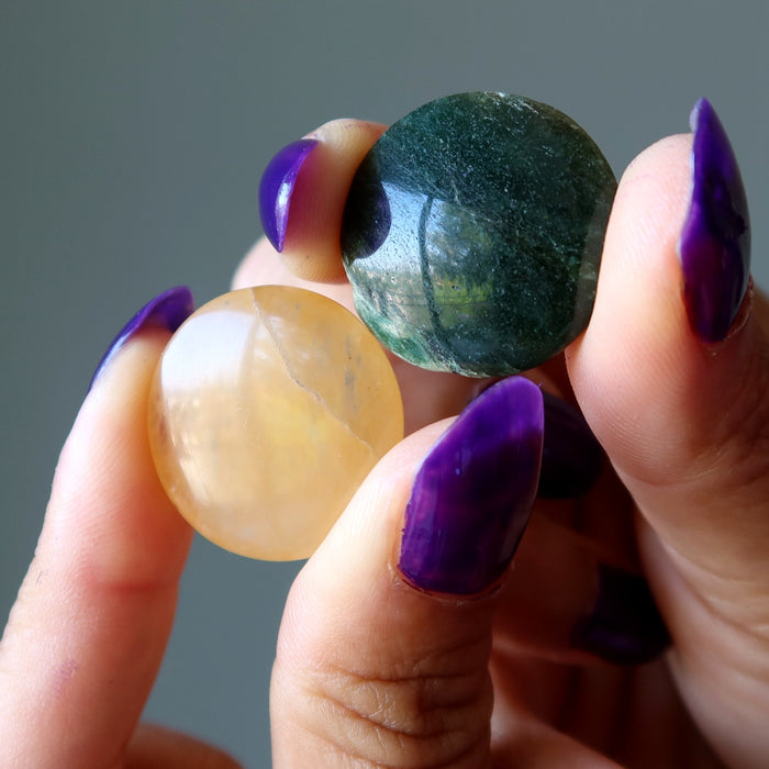 Your new amulets are polished from natural Aventurine. This is a dark green Aventurine and a yellowish-orange Aventurine. They are polished into puffy circular coin shapes that can be used for portable healing or jewelry.