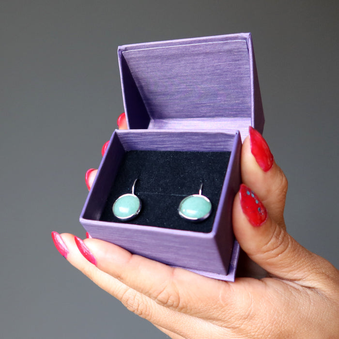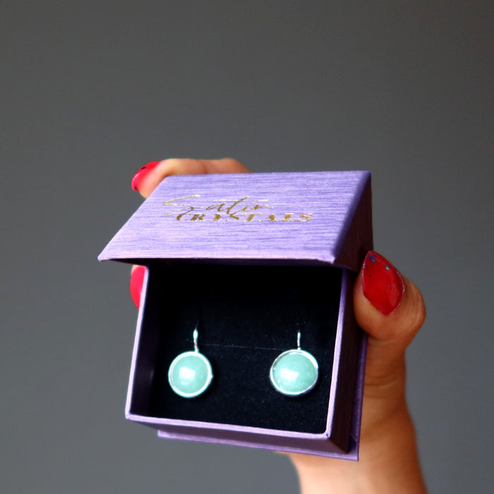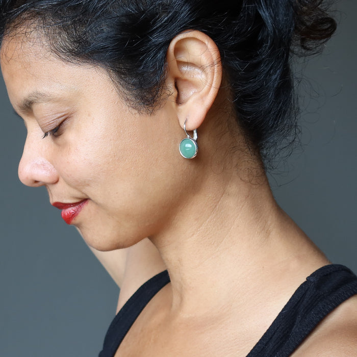 Your new earrings feature natural Aventurine gemstones. These are translucent green stones polished into round cabochons and set in silver-plated steel earrings. The earrings have lever back clasps to secure safely to your earlobe.