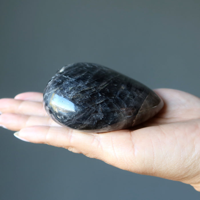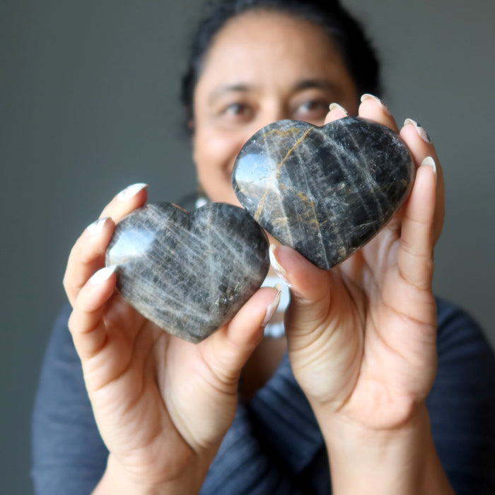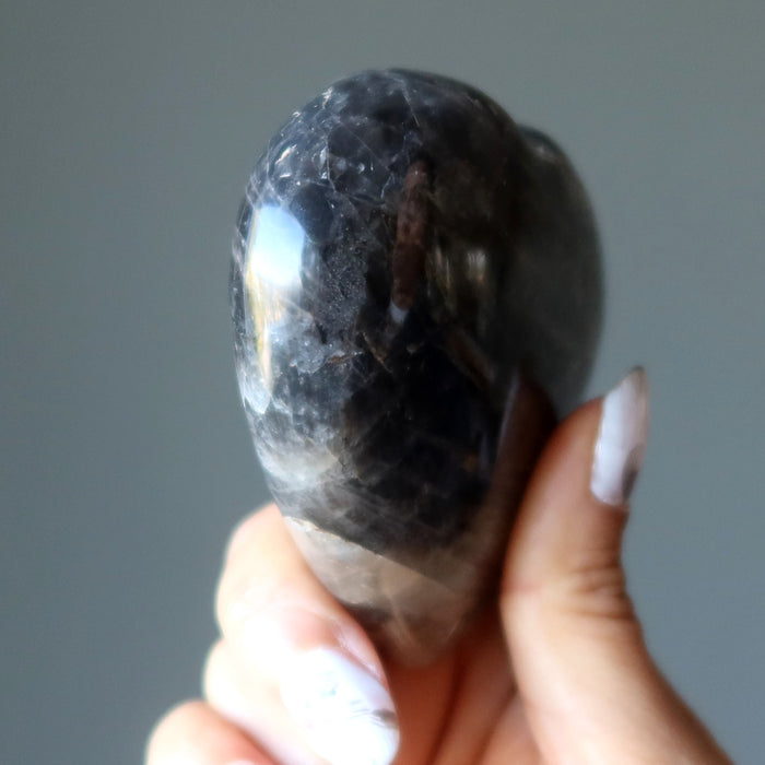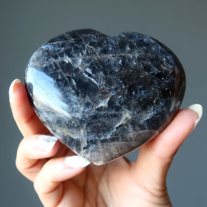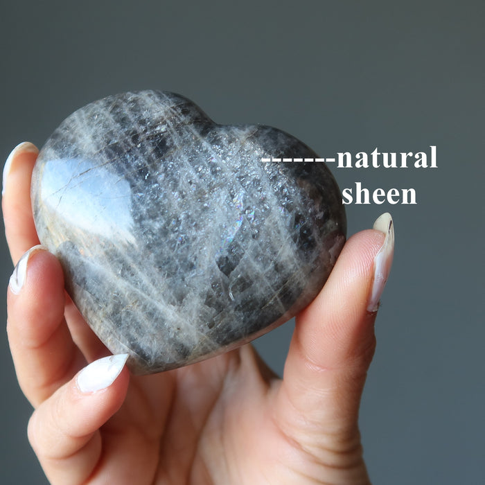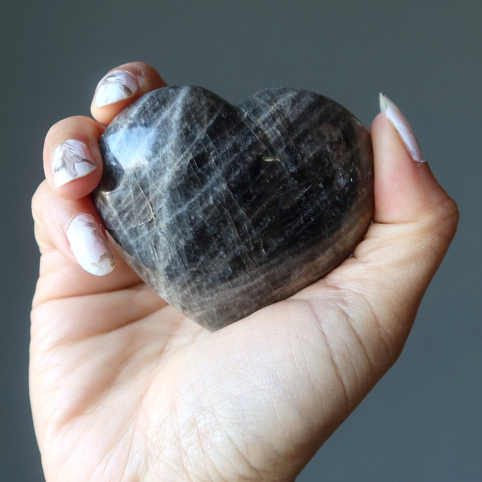 Your deepest fantasies come true when you wish upon the Black Moonstone heart. This shimmering sheen crystal radiates with lunar energy and manifestation powers. Live with your whole heart, fulfilling your desires completely. The gemstone heart is for brave lovers and souls.