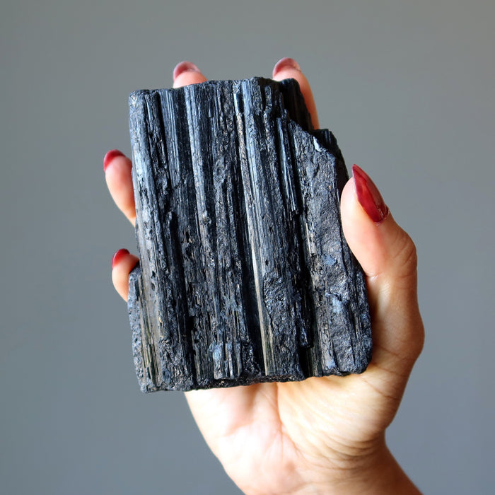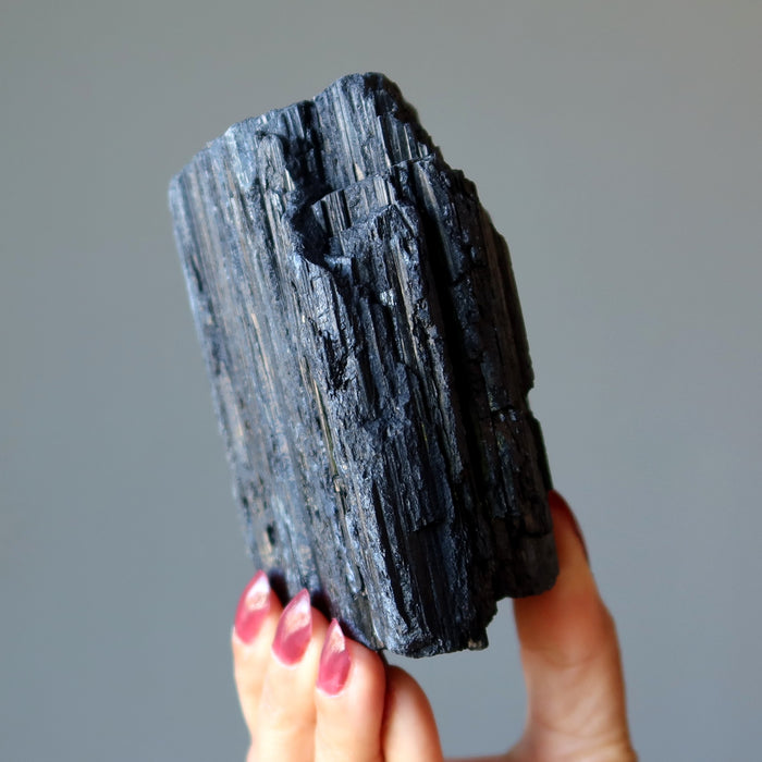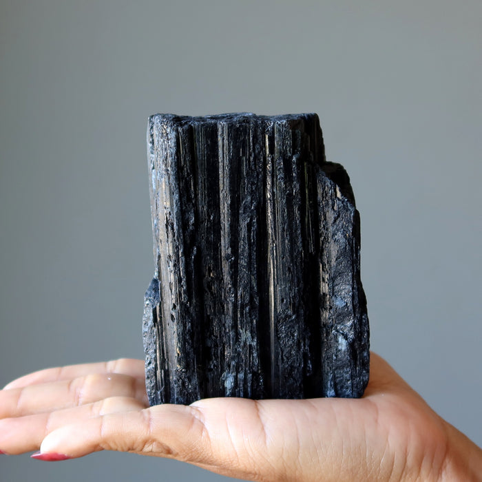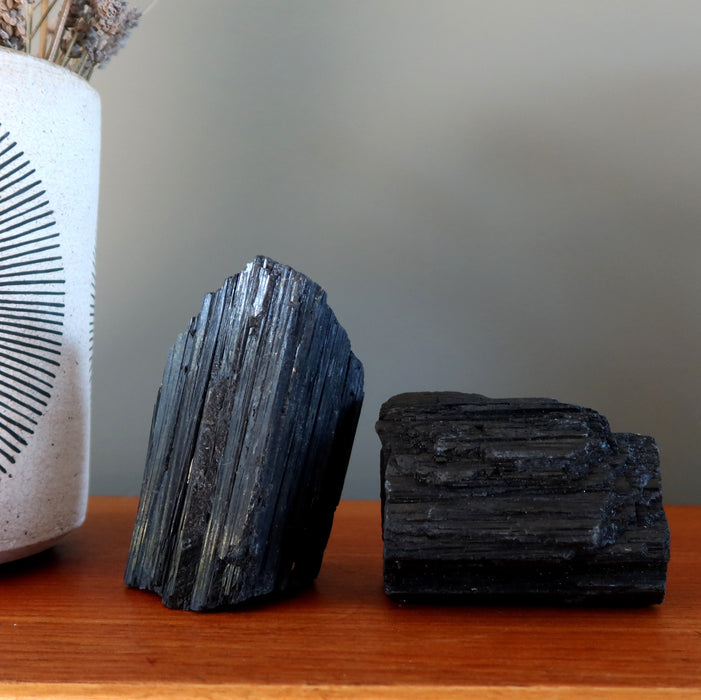 Your new crystal is a raw, untreated specimen of Black Tourmaline. This rough stone has organic striations and spots of mineral occlusions. It can stand upright. Each is unique.
