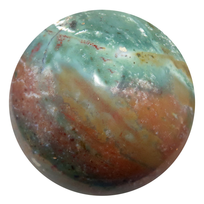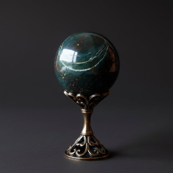 Your new sphere is polished from natural, untreated Bloodstone from India. This round stone is dark green with colorful patterns and red, yellow, and white spots. Each stone is unique and retains natural pits, grooves, and inclusions. Showcase your crystal ball by adding a display stand.