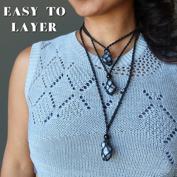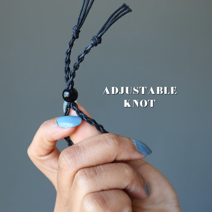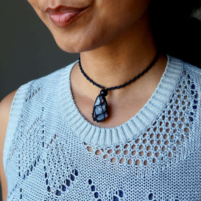 Your new necklace features natural and coated Calcite gemstones. This is a waxy blue crystal in its rough state. It is secured in an adjustable black macrame necklace. Each necklace is beaded in the Satin Crystals studio in the USA.