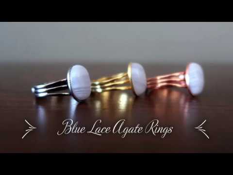 Your ring features natural and untreated Blue Lace Agate. This is a translucent blue-banded stone polished into a smooth oval cabochon and set in a copper brass ring. Each stone is unique. Assembled in the Satin Crystals studio in the USA.